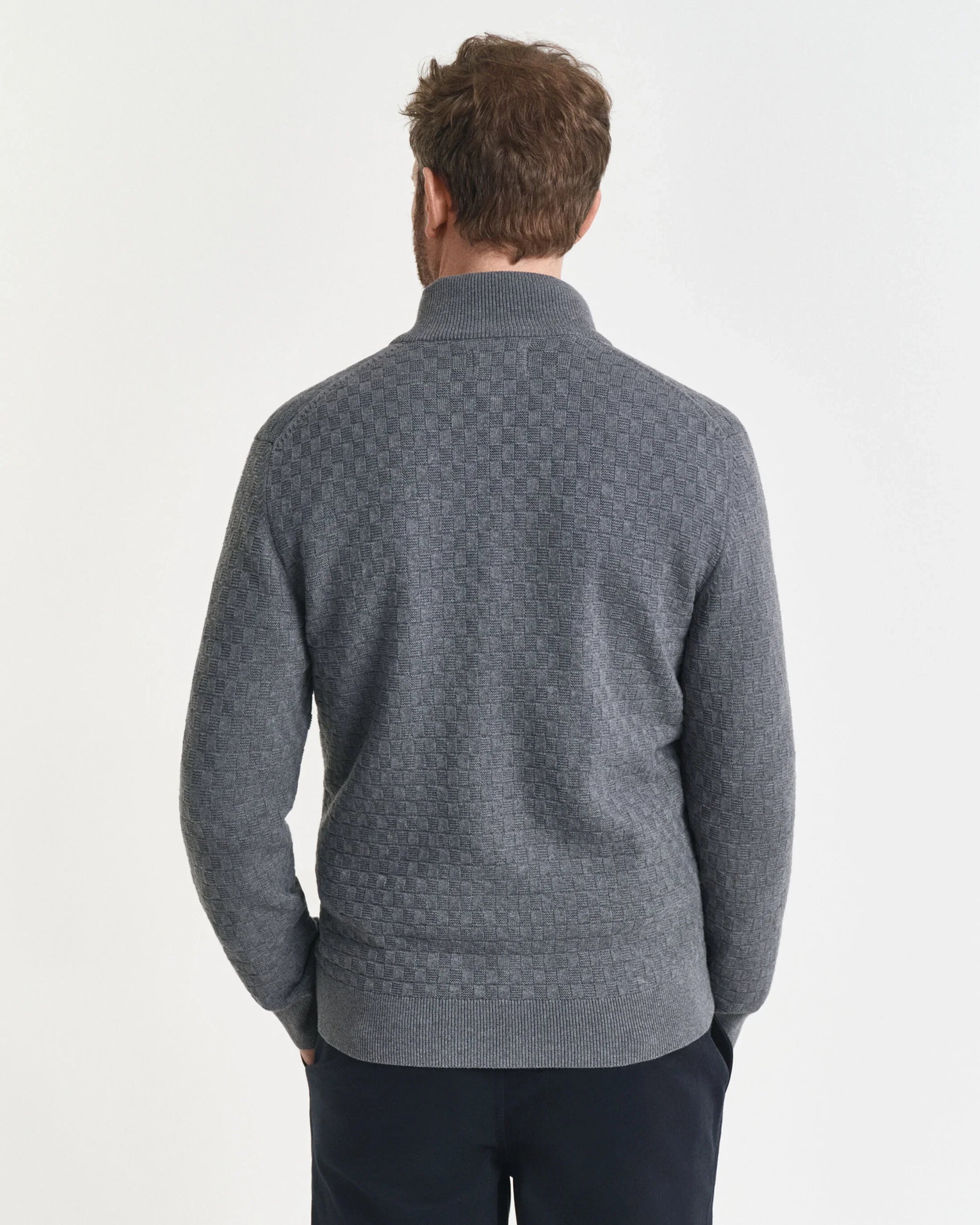 A Premium Zip-Through Sweater Featuring A Refined Micro-Textured Knit. Made From Breathable Cotton With A Smooth Finish—Ideal For Both Smart And Casual Looks.