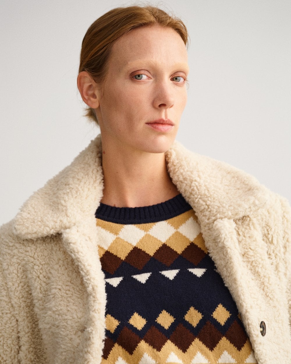 Crafted in a double-layer wool blend fabric with an elegant luster and hand feel, this cropped jacket is designed with a preppy houndstooth structure and pattern. With a relaxed and slightly boxy fit, this piece is modern with its wide sleeves, tall stand collar and button details.