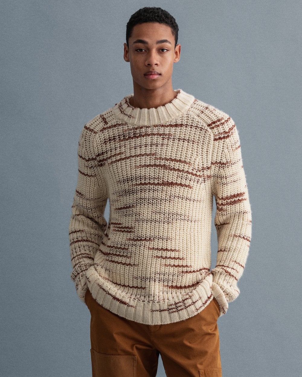 A streaked effect, achieved through a special spinning technique, gives this mock neck sweater a bold patterned look. Fashioned with a chunky rib texture and a mock neck design in 100% lambswool, this is an incredibly cozy sweater that will keep you warm all winter.