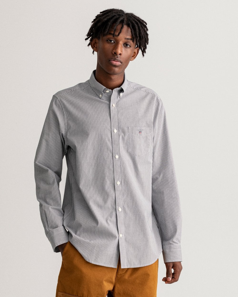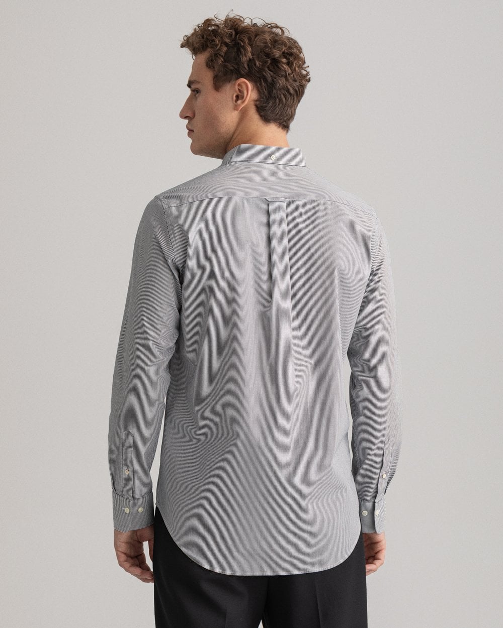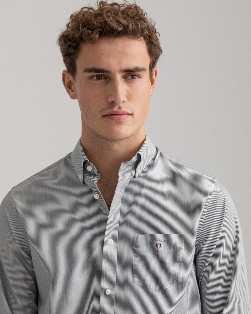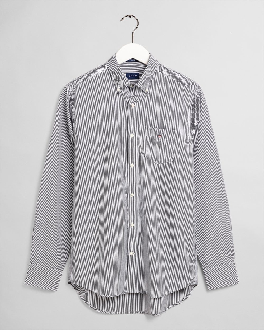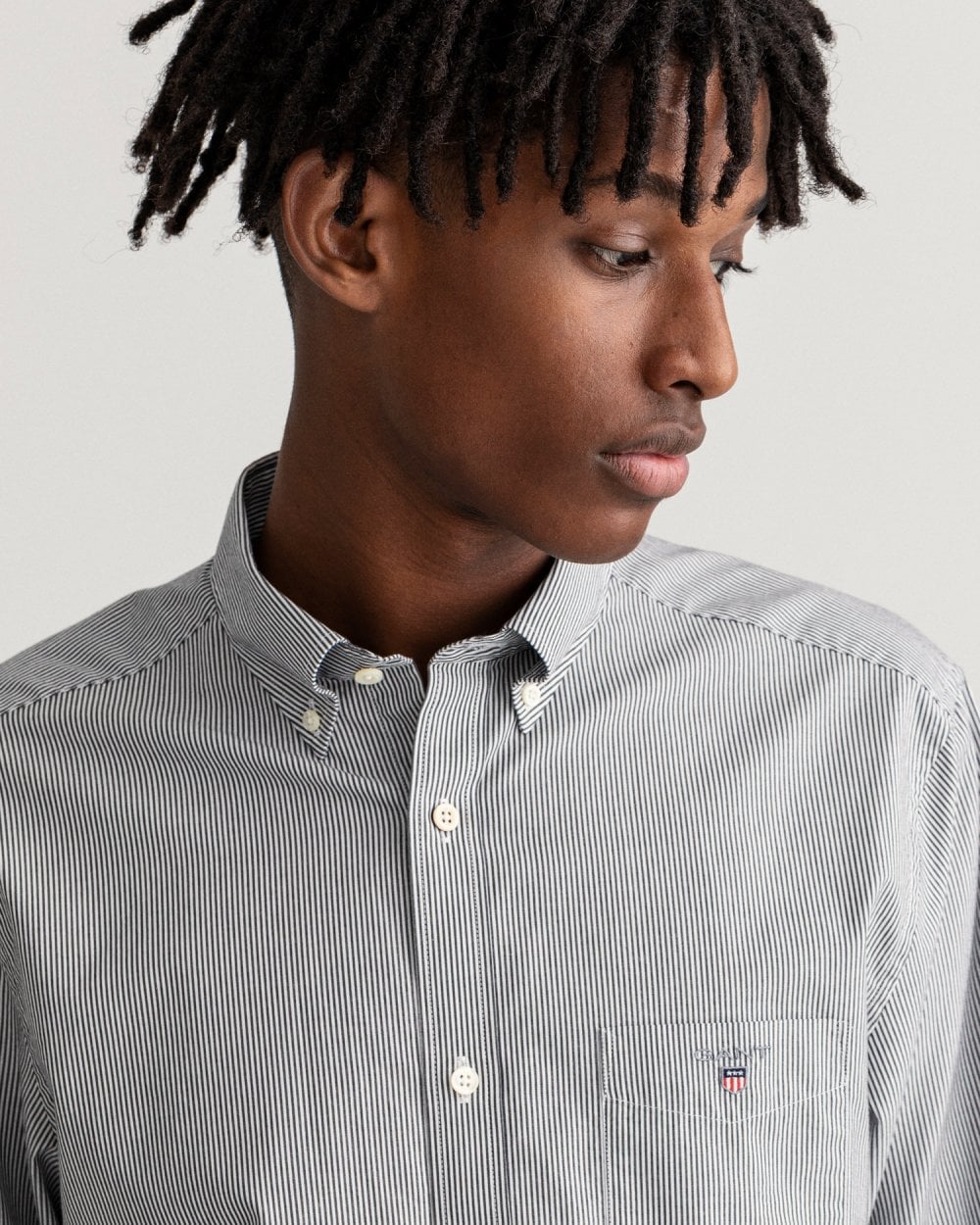 Crafted in a classic cotton broadcloth, this regular fit banker stripe shirt has our signature button-down collar, shield logo embroidery, and locker loop and boxpleat at the back.
