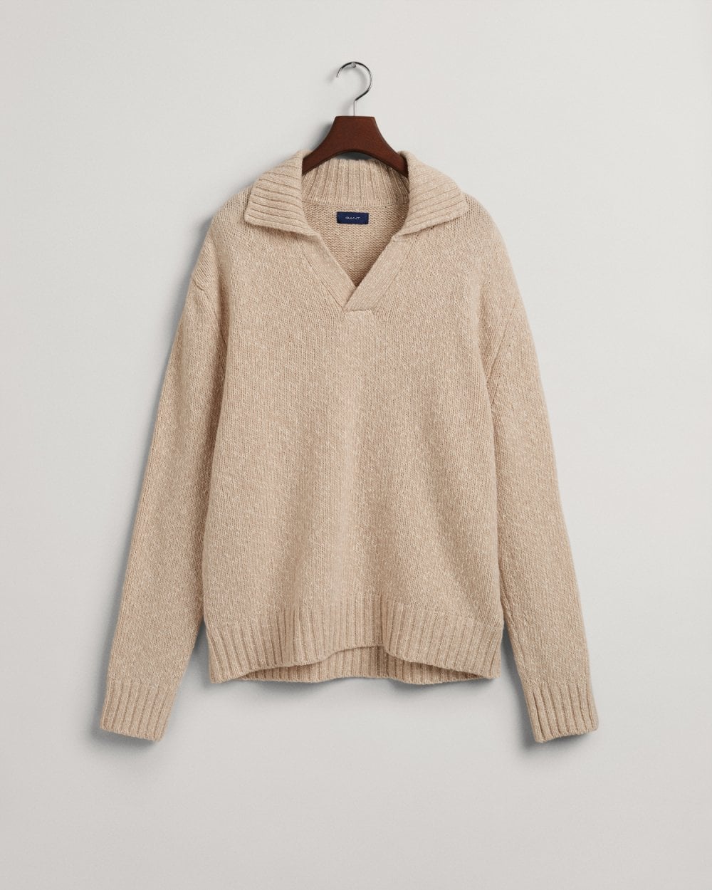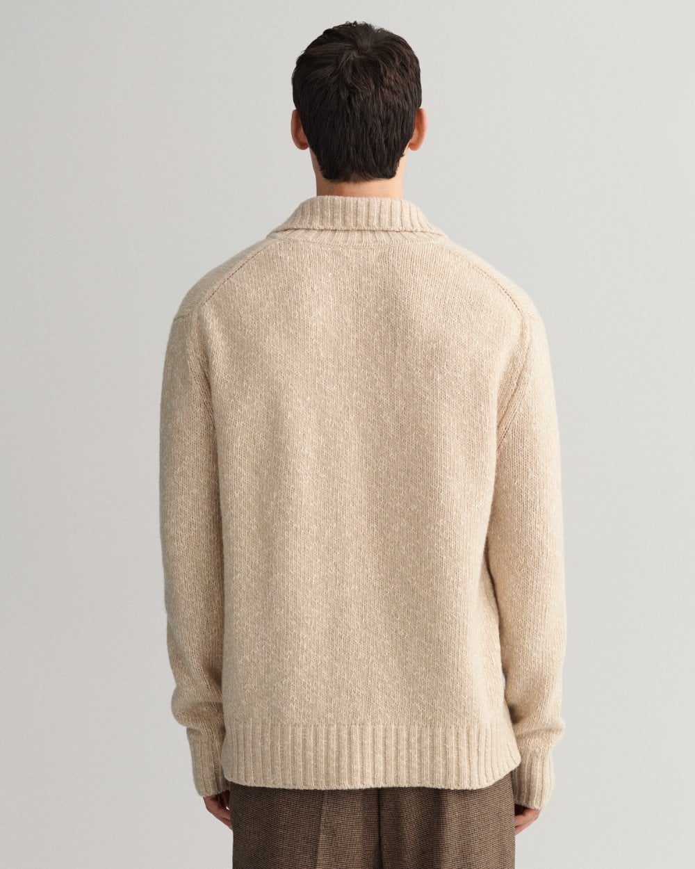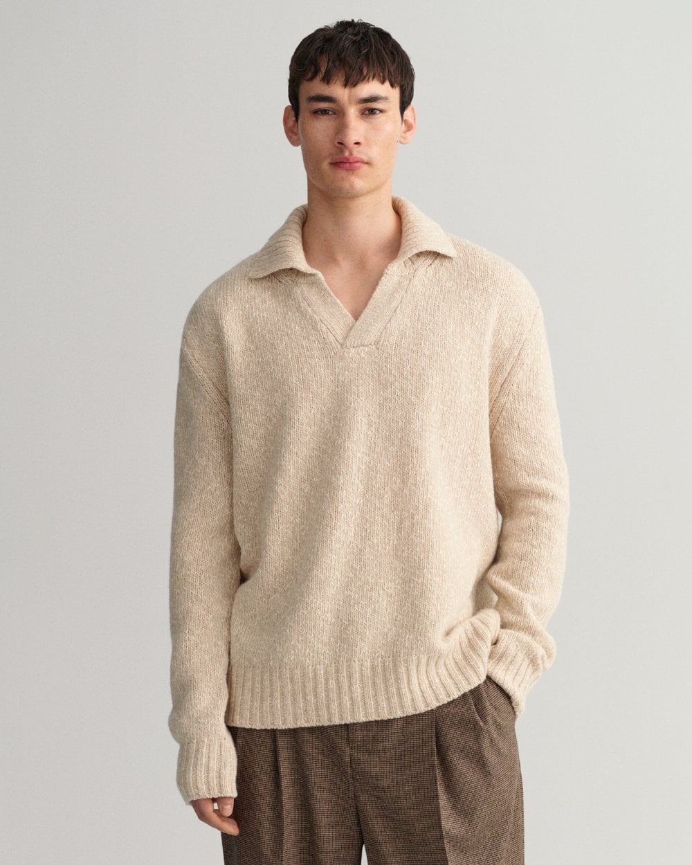 Made of a wool-cotton blend with slub yarns for a textured look and feel, this sweater is an elevated knitwear piece. It is designed for a relaxed fit with an open V-neck and polo collar for a sporty touch, and finished with chunky rib detailing.