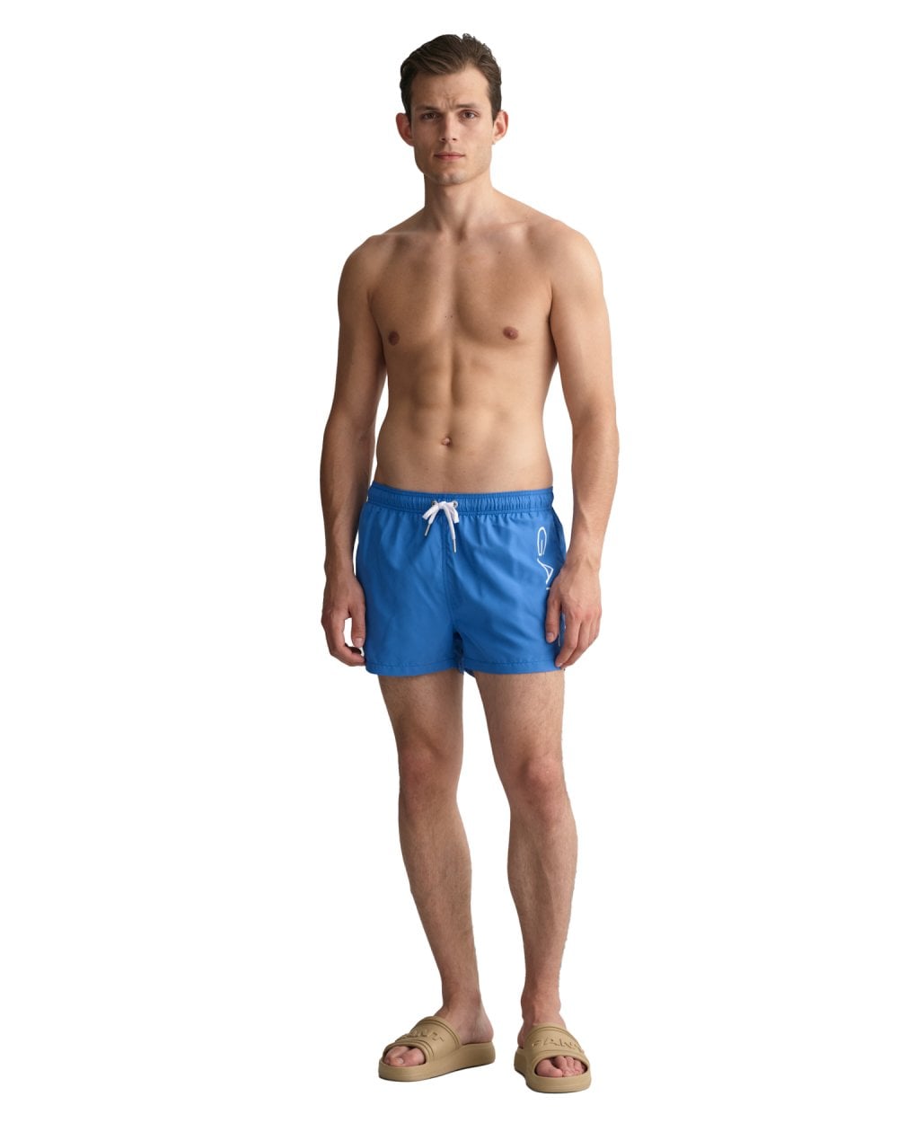 Crafted in recycled polyester, the Short Cut Logo Lightweight Swim Shorts sport a shorter length, an elastic waistband with a contrast-color drawstring, and a mesh inner pant. They also feature a white GANT logotype on the side for a bold, sporty look.